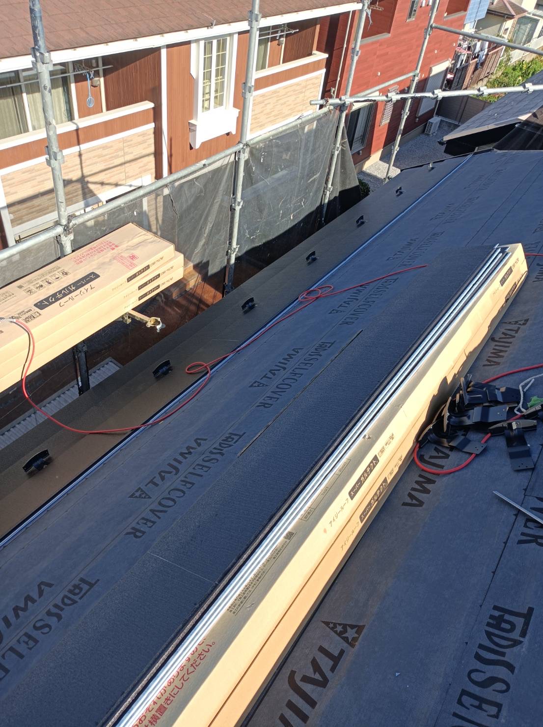 全体を高圧洗浄したら、このように既存屋根の上からルーフング(防水シート )を敷き次にガルテクト(屋根材)を下から張り、雪止めも同時施工していきます。(下写真)